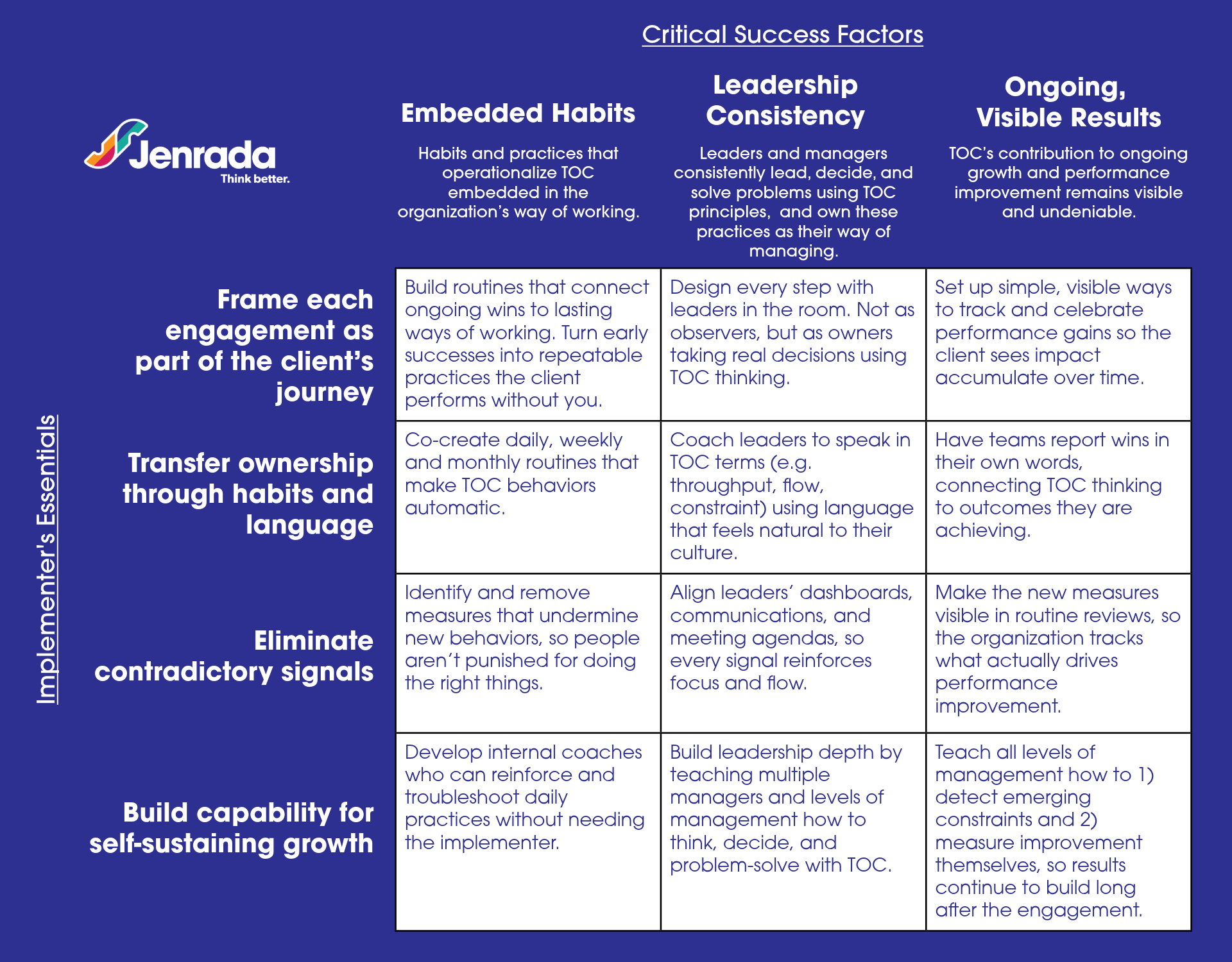 - Embedded Habits. Habits and practices that operationalize TOC must be embedded in the organization’s way of working.
